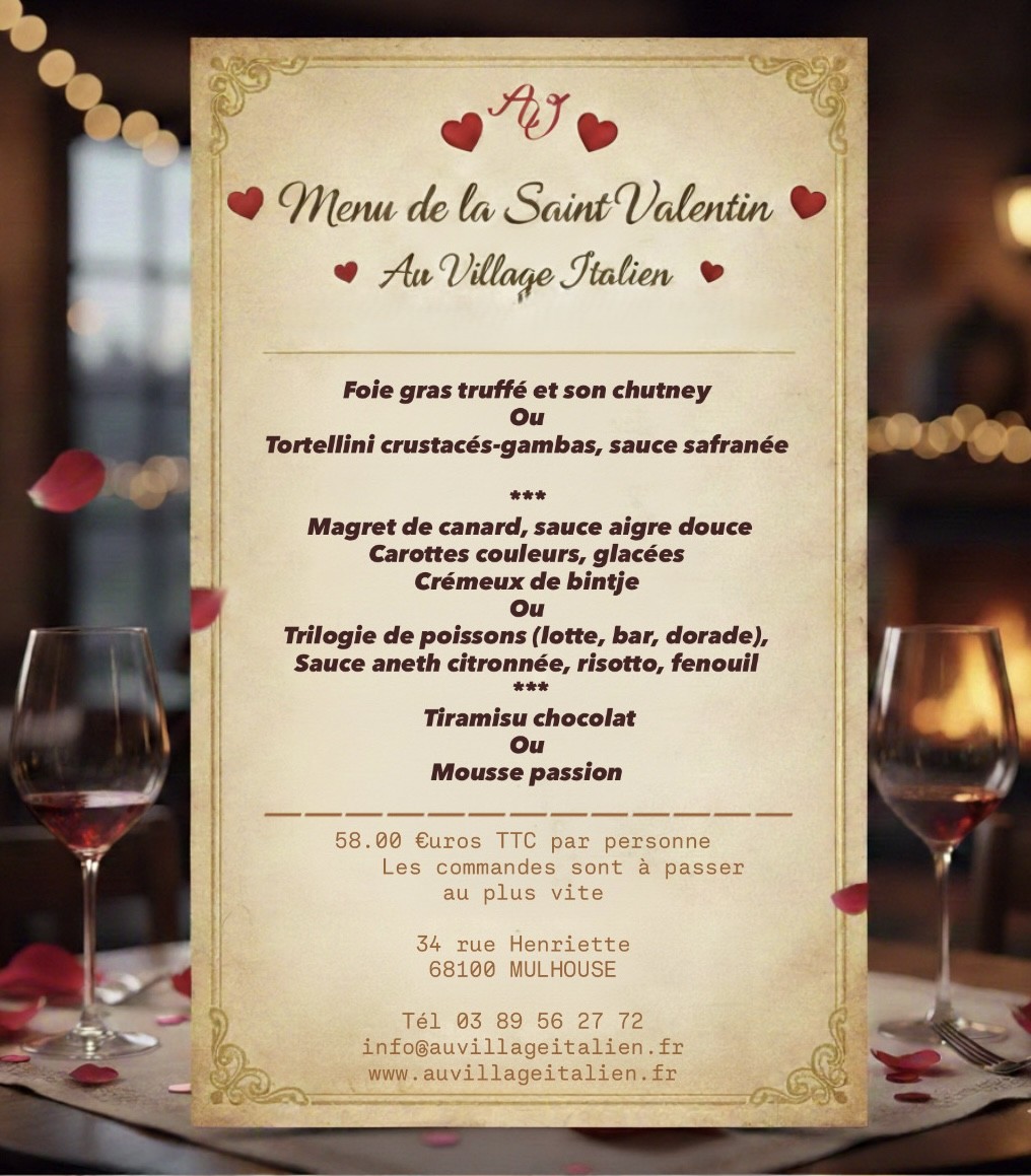Notre équipe vous a concocté un menu raffiné, mêlant saveurs de la mer et tradition italienne, pour célébrer l’amour tout en gourmandise.